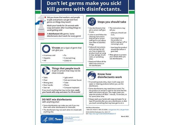 The National Institute for Occupational Safety and Health (NIOSH) has released a free printable poster, “Safe and Proper Use of Disinfectants to Reduce Viral Surface Contamination in Correctional Facilities.”