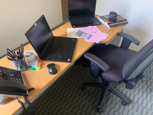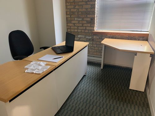 Acceptable: clean room, closed blinds, computer on desk, nothing on desk except two tissues
