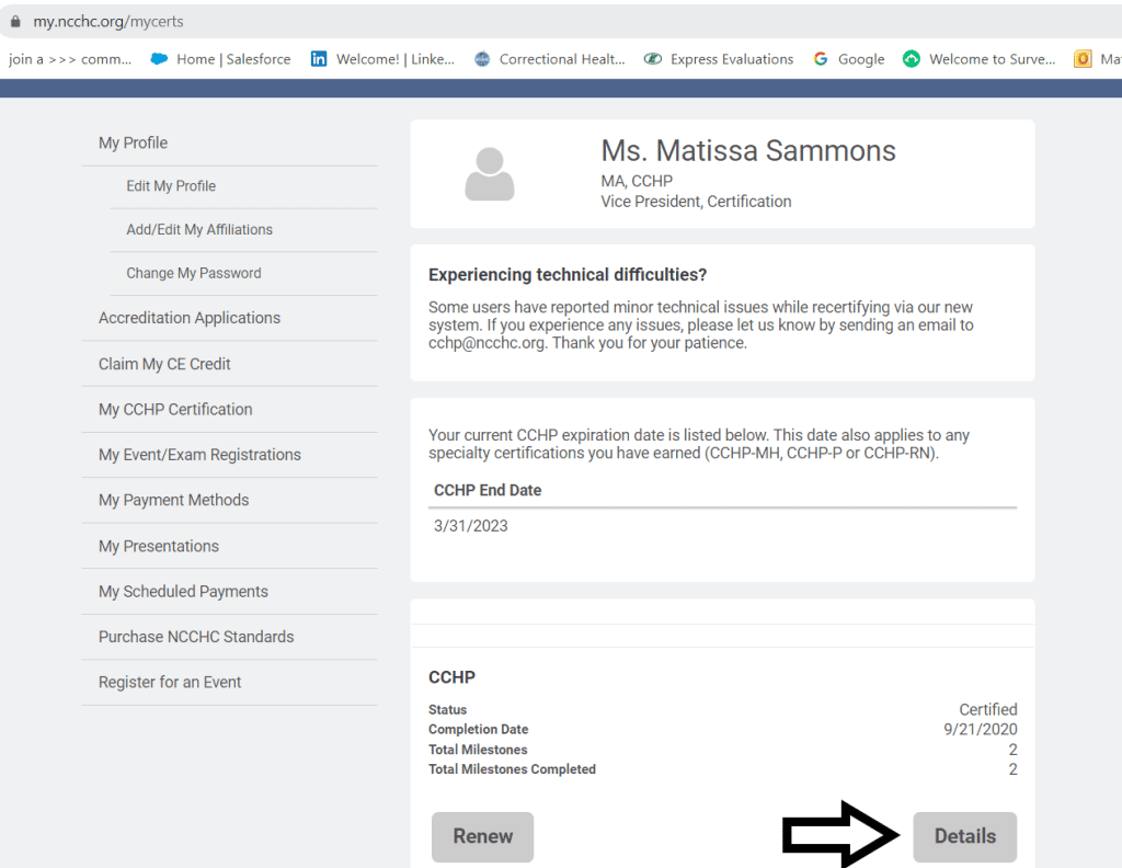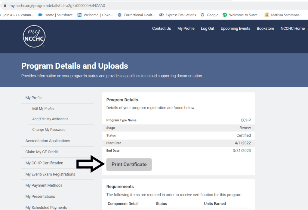 Print Your Certificate Home / Professional Certification / Print Your Certificate Certification CCHP Exam Details – CCHP Applying for CCHP Study Materials CCHP CCHP-CP Exam Details Applying for CCHP-CP Study Materials CCHP-MH Exam Details CCHP-MH Applying for CCHP-MH Study Materials CCHP-RN Exam Details Applying for CCHP-RN Study Materials CCHP-A Exam Details Applying for CCHP-A Study Materials Testing Options Testing Online Exams On-Site Standards Review and Exam Exam Calendar Digital Badges Recertification Certification FAQs Certification as a Talent Management Strategy Program Governance Print Your Certificate To download your renewal certificate, log in to your account. Once logged in, select: “My CCHP Certification” Select “Details” under CCHP Choose “Print Certificate”